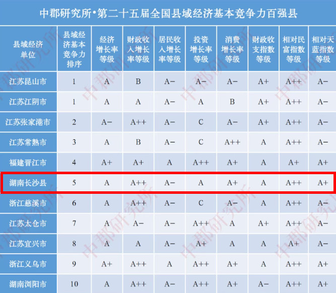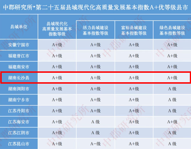 长沙晚报掌上长沙11月11日讯(星沙时报全媒体记者 李依露)11月11日,中郡研究所发布《第二十五届县域经济与县域发展监测评价报告》,长沙县再度彰显强劲发展实力,位列全国县域经济基本竞争力百强县第5位。同时,在全国县域经济和社会综合发展百强县中位居第4,获评全国县域现代化和高质量发展A+优等级县市,并稳居中西部县域综合实力首位,持续巩固“中西部高质量发展领头羊”地位。